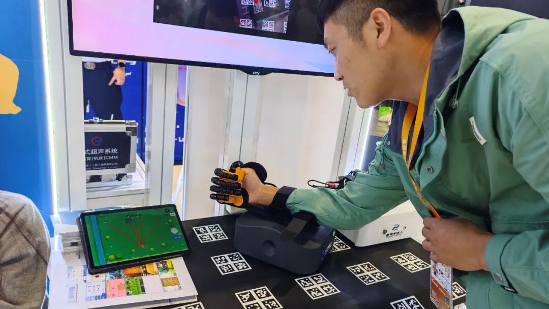 上海智康加机器人有限公司展出了用于中风、偏瘫、脑梗患者上肢康复训练的个人妙手版机器人。患者可将肘部固定在机器人上方,穿戴好气动手套,按照提前设置好的