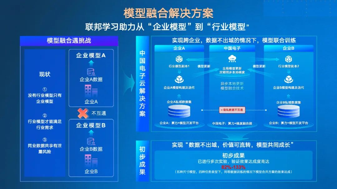 中国电子云已实现技术突破,打造出一套模型融合方案:通过联邦学习技术,在本地完成企业模型训练,仅全局更新模型梯度,从而实现在各企业数据不出域的前提下,联合